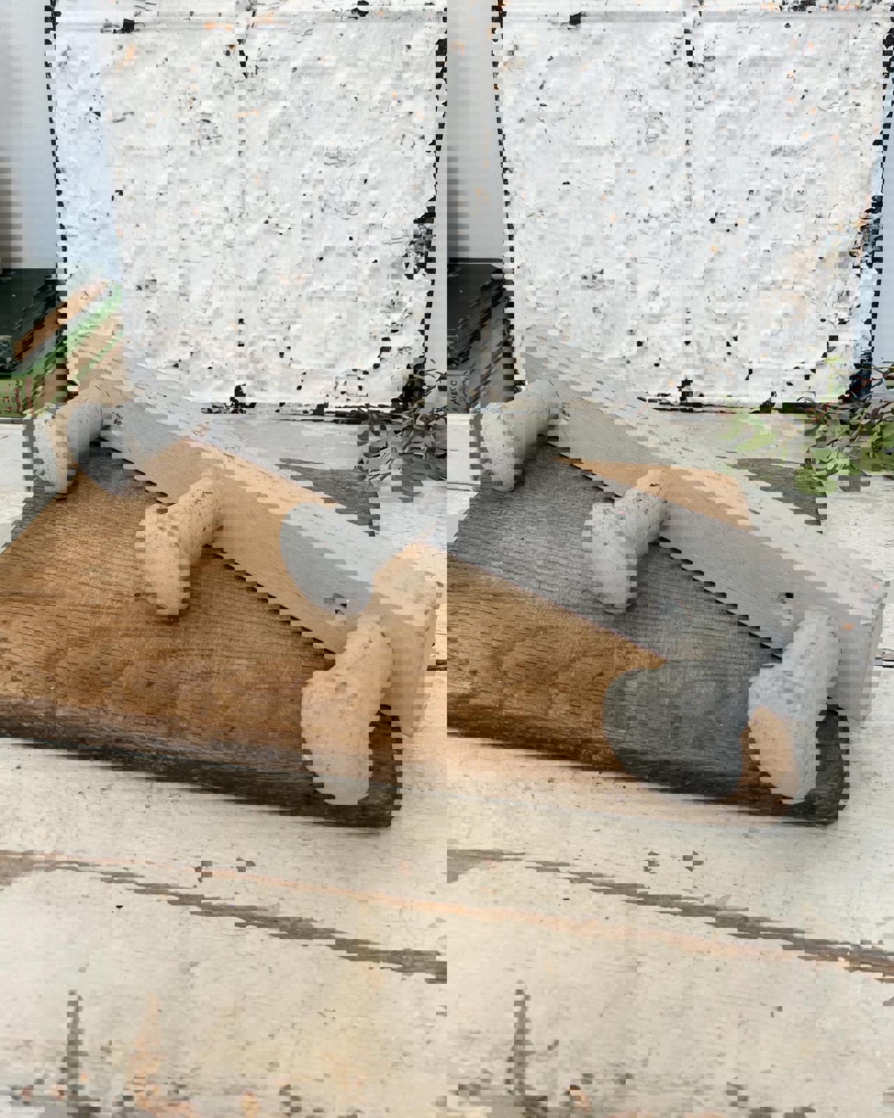 A charming set of wall hooks that will add some rustic, vintage character to your home. They are made of wood, have grey chippy paint. There are 3 chunky wooden knob hooks. They would look lovely in a hallway for coats, a kitchen or utility room or any room.
